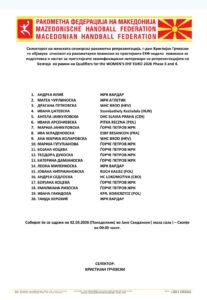 Селекторот на женската сениорска ракометна репрезентација, г-дин Кристијан Грчевски го објави  списокот на ракометарки повикани за престојната ЕХФ недела  повикани за подготовка и настап за претстојните квалификациски натпревари со репрезентацијата на Белгија. Во составот ја нема Сара Ристовска поради повреда